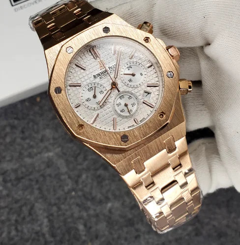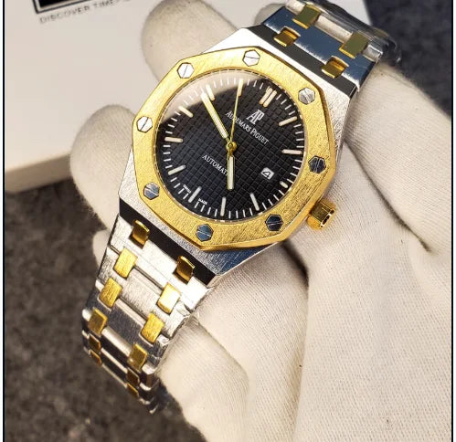 Typically features the iconic octagonal bezel with 8 visible screws โ a signature of the Royal Oak.